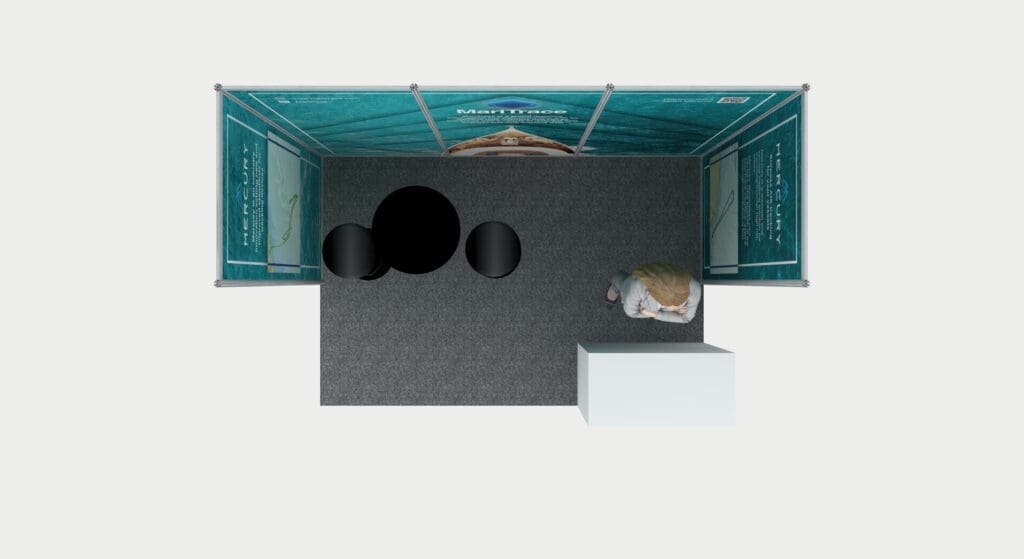 Our solution combined portable exhibition design with high-impact visuals. The compact yet striking layout prioritised digital demonstrations — placing live tech previews, screen displays, and one-to-one conversations centre stage. Inspired by both the marine environment and the tech sector, we used clean lines, bold branding, and premium finishes to reflect superyacht luxury while keeping the design streamlined and practical.